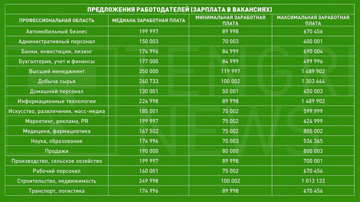 Согласно ответу на запрос редакции от платформы по поиску вакансий HeadHunter.kz, самые высокие предложения заработных плат в Казахстане наблюдаются в сферах информационных технологий, добычи сырья, строительства и недвижимости и высшего менеджмента.