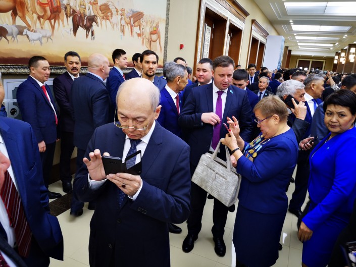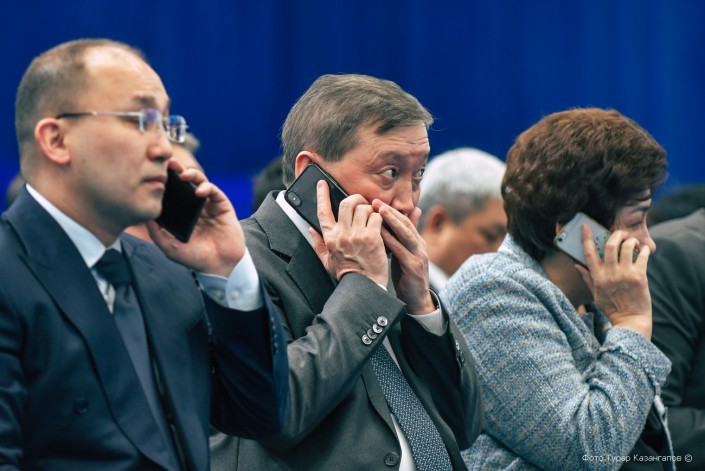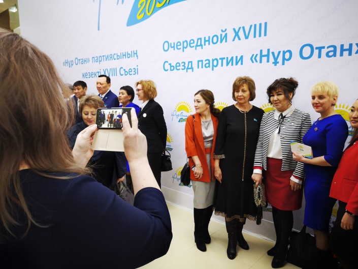 У делегатов съезда "Нур Отан" в распоряжении было более двух часов. Нурсултан Назарбаев должен был прибыть лишь к 11 утра. Ближе к 9:00 холл Дворца Независимости постепенно наполняли нуротановцы из всех регионов страны. Что они делали? А что еще делать празднично одетым людям? Конечно, фотографироваться. Нужно ли говорить, что в этот юбилейный съезд партии дамы были при параде, да и мужчины были под стать им. Не пропадать же такой красоте.