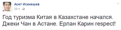 "Джеки в Астане!" - написал он на своей странице в Facebook. Позже появились фотографии счастливых Карина, акима Астаны Асета Исекешева и не менее счастливого и жизнерадостного героя той ночи и всего следующего дня - Джеки Чана.