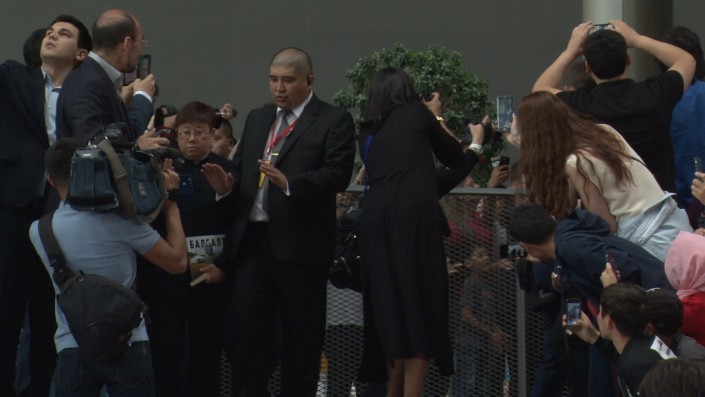 Здесь было очень много людей, которые вдоль красной дорожки ждали главного гостя фестиваля китайского кино - Джеки Чана. Но для начала по этой дорожке прошли известные казахстанцы.