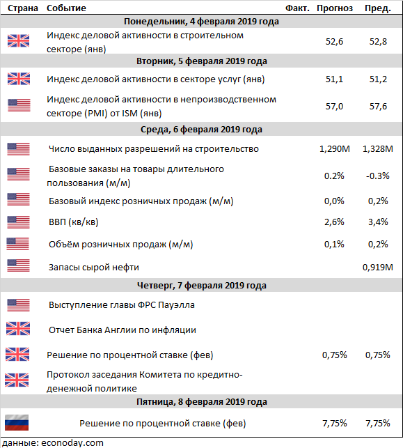 Торговые переговоры между США и Китаем на прошлой неделе были конструктивными, хотя, как и ожидалось, крупных прорывов не произошло. Китай пообещал "существенно" расширить закупки американских товаров, и обе стороны планируют дальнейшие дискуссии, чтобы достичь сдвигов в переговорах, так как остался всего месяц до 1 марта, когда администрация Трампа собирается повысить тарифы. По заявлениям президента США, вскоре после празднования лунного Нового года, в середине февраля в Китай будут направлены министр финансов Стивен Мнучин и торговый представитель Роберт Лайтхайзер, чтобы провести следующий раунд переговоров. Ко всему прочему, президент Трамп поднял вопрос о возможности двух встреч с президентом Китая Си Цзиньпином: (1) в Китае во время второго саммита с северокорейским лидером Ким Чен Ыном в конце февраля и (2) в США, чтобы закрыть сделку.