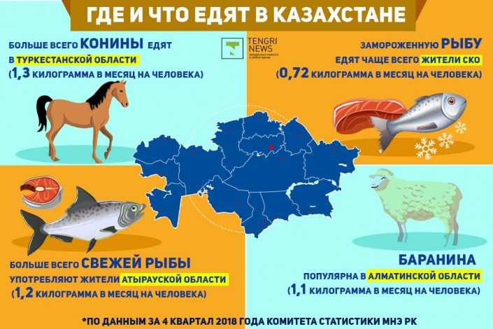 Редакция Tengrinews.kz к Наурызу предлагает узнать, где больше всего в Казахстане едят конины, рыбы и чаще покупают чай. Данные предоставлены Комитетом по статистике МНЭ РК.