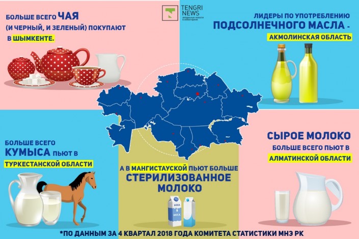 Кумыс больше всех пьют жители Туркестанской области, где в среднем один человек в месяц выпивает 0,05 литра. Молоко сырое чаще пьют в Алматинской области, где один житель в месяц выпивает 3,661 литра.  Молоко ультрапастеризованное, стерилизованное покупают больше в Мангистауской области, 4 литра в среднем на каждого жителя. А молоко пастеризованное предпочитают больше в Астане. 3,2 литра в месяц выпивает один житель столицы.