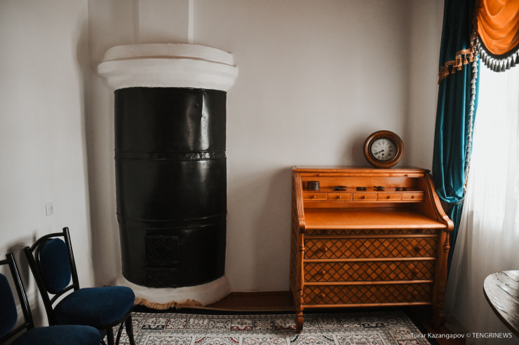 "Восстановление шло по описаниям тех, кто здесь гостил. Это комната Шокана Уалиханова, его рабочий кабинет. В 1985 году на Алматинской текстильной фабрике был соткан ковер в одном экземпляре специально для этого музея. Дорожный сундук Шокана Уалиханова в оригинале. Портрет из риса от тружеников тыла", - объясняет Дамир Тулеуов.