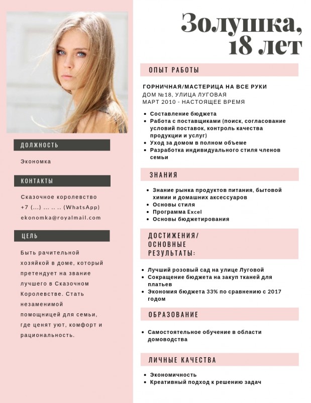 Таким образом, у Золушки получилось бы примерно так: Сказочное Королевство, Золушка, 18 лет, +7 (...) ... .. .., [email protected]. К резюме можно прикрепить фотографию.