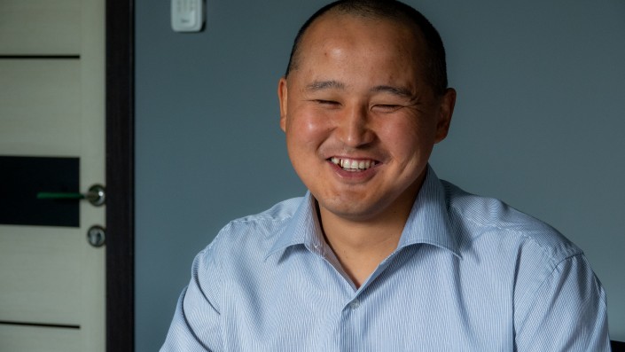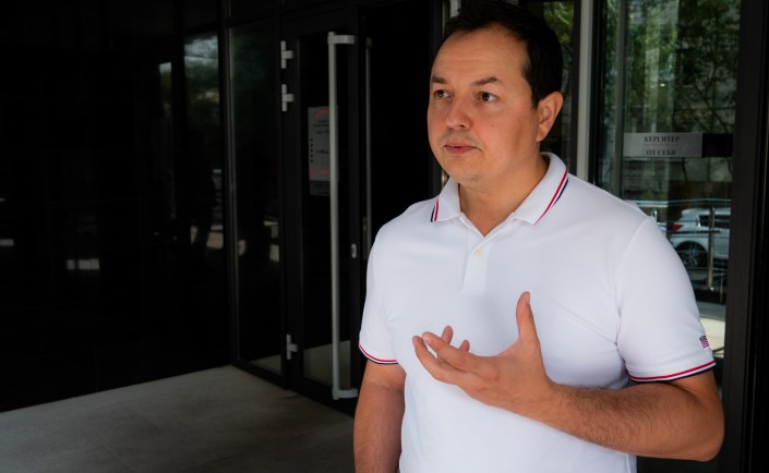 Кенжегул Сейтжан, он видит только силуэты, передвигается с помощью палочки, на интервью он приехал на социальном такси. Предприниматель, в 2017 году он открыл по франшизе хостел, который принимает ежемесячно 1500 человек.