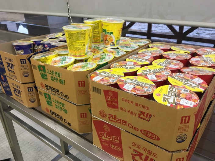 Представителей СМИ иногда тоже кормят бесплатно. Во-первых, на завтраке. Но, конечно, выбор не такой, как у спортсменов. Отдельно стоит отметить медиацентр. Обычно на крупных международных турнирах всегда бывает бесплатное питание. В корейском олимпийском медиацентре оно тоже есть. Желающие могут бесплатно заварить себе лапшу быстрого приготовления. Лапша здесь трех видов - острая, очень острая и очень-очень острая. Поэтому те, кто привез с собой баурсаки и казы, не ошиблись.