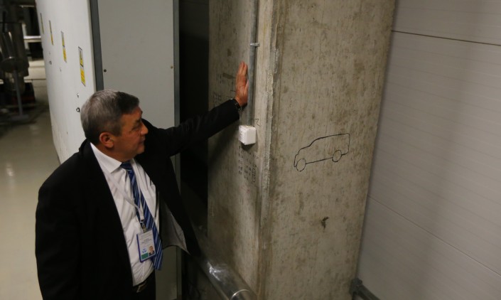 Бакыт Атшабар, директор научного центра демонстрирует бетонные блоки, которые обеспечивают повышенную сейсмостойкость