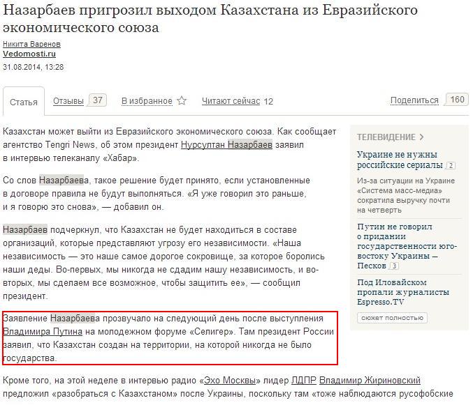Тем не менее, многие российские СМИ начали утверждать, что заявление Назарбаева стало ответом на выступление Путина, чего, из-за разницы в датах, никак быть не могло. К примеру, на сайте газеты "Ведомости" появилась новость о том, что Глава Казахстана "пригрозил выходом из экономического союза". В нем указывается, что "заявление Назарбаева прозвучало на следующий день после выступления Владимира Путина на молодежном форуме "Селигер". При этом стоит отметить, что издание в новости ссылается на Tengrinews.kz, а именно на материал, опубликованный 25 августа, за четыре дня до выступления Путина.