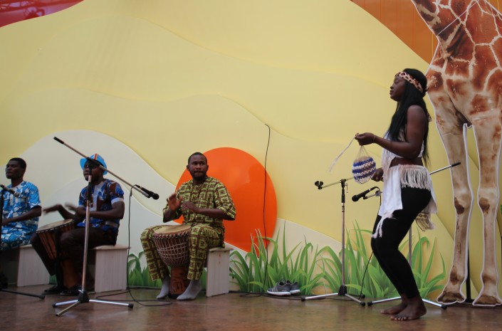 У входа в африканский павильон под ритмы барабанов танцует девушка. И сама музыка, и своеобразные движения этой африканки не дают посетителям выставки пройти мимо. Экзотика. В считанные минуты сцену окружают зрители.