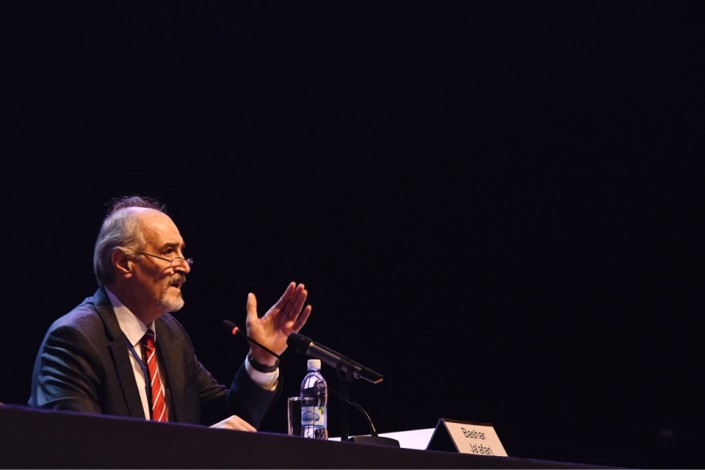 Но у иностранной прессы все равно было много вопросов. И в какой-то момент, чтобы их остановить, глава делегации сирийского правительства, постоянный представитель Сирии в ООН Башар Аль-Джафари сам начал брать интервью у репортеров.