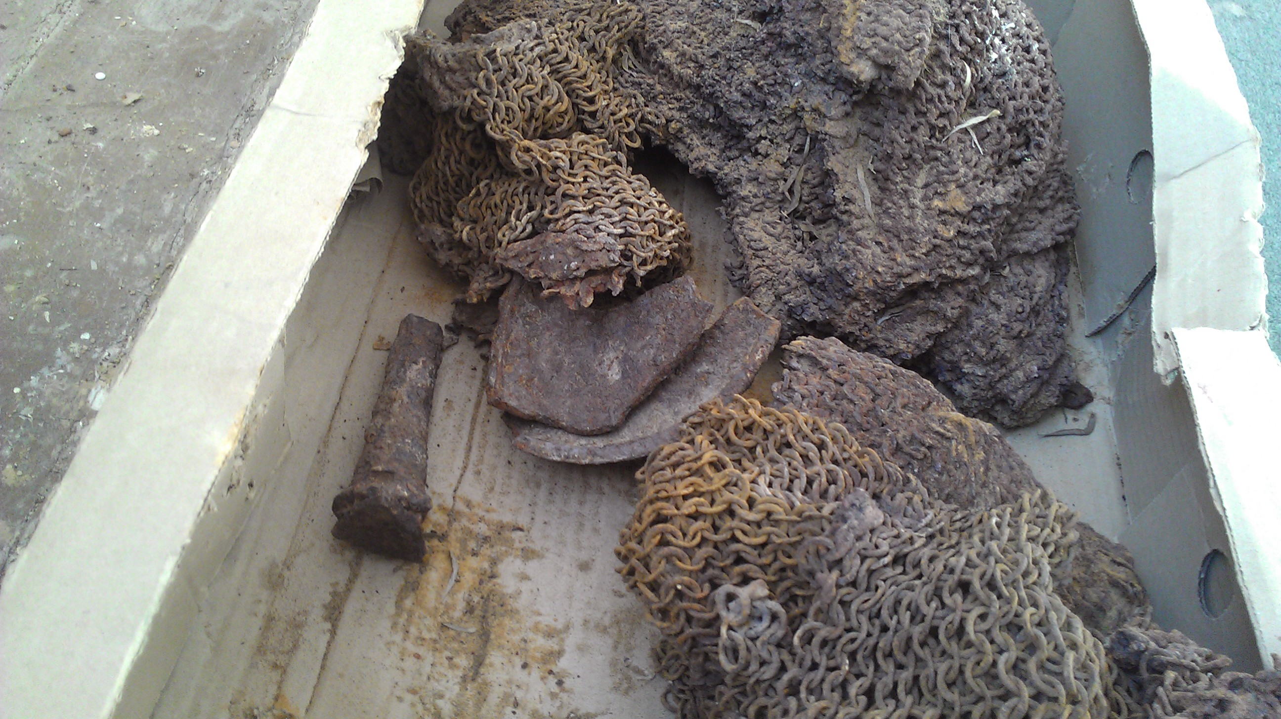 Здесь две кольчуги, накидки под шлем и куски самого шлема