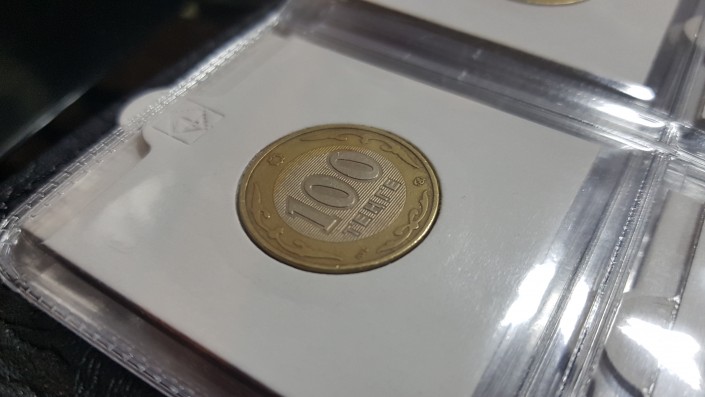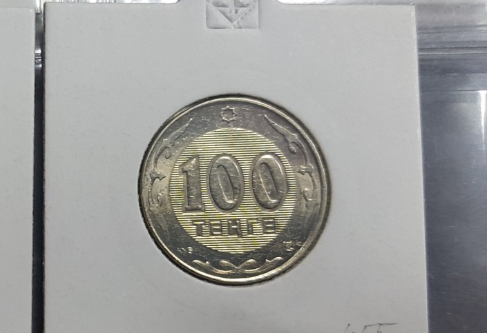 Эта стотенговая монета вообще состоит полностью из желтого металла.