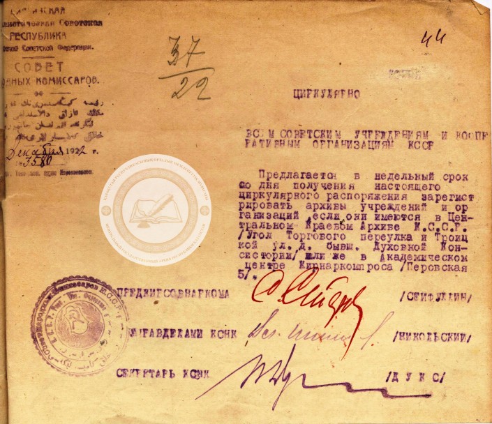 После гражданской войны и в первые годы становления молодой Казахской Советской Республики положение архивного дела было катастрофическим, масса архивов была уничтожена, особенно военных. Так, в самом Оренбурге из 20 военных архивов сохранились лишь только жалкие остатки документов нескольких учреждений. Разрушение их производилось большей частью солдатами, так как в брошенные учреждения прежде всего на постой ставили солдат, которые и громили архивы, пуская их на цигарки, письма, оберточные материалы, топливо. "Добивали" архивы уже местные жители, когда за недостатком топлива таскали целые ворохи бумаги для топки печей.