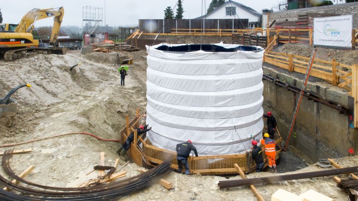 По данным представителей Umwelt Arena, одних панелей солнечных батарей для подачи энергии и тепла недостаточно. Поэтому разработчики установили под домом резервуары с водой, 250 кубометров каждый. За счет гидролиза воды вырабатывается тепло, которое хранится в емкостях.