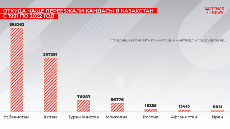 По данным Министерства труда и социальной защиты РК, по состоянию на 1 июня 5,6 тысячи этнических казахов получили статус кандаса. А уже в ноябре количество увеличилось до 15 637. И это максимальный показатель за последние 5 лет. Самый минимальный показатель по переезду кандасов на историческую родину с 2000 по 2022 годы был зафиксирован в 2015 году, когда в Казахстан прибыло 4 949 этнических казахов.