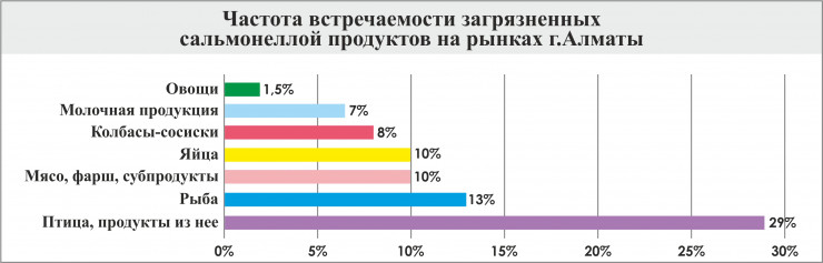Казахская академия питания провела исследование по оценке загрязненности сальмонеллой реализуемых на рынках города Алматы пищевых продуктов. Всего было закуплено 500 проб продуктов как фабричного/промышленного, так и домашнего/фермерского производства, доступных на рынках города. Всего из 500 исследованных проб продуктов обсеменение сальмонеллой выявлено в 32, то есть в 6,4 процента.