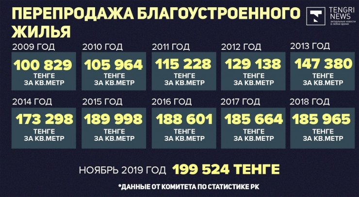 10 лет назад цена квадратного метра на вторичном рынке жилья была равна 100 829 тенге. В ноябре 2019 года тенге сумма возросла до 199 524 тенге.