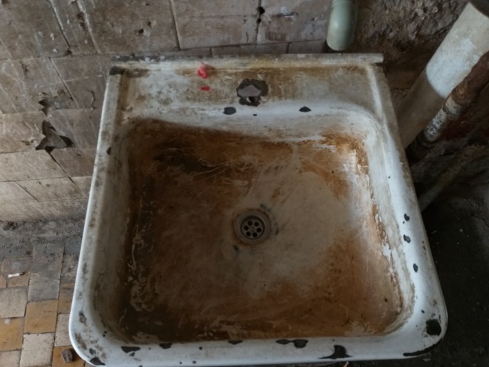 На фоне комнаты с потеками, облупившимися стеной, потолком и полом, цвет этого умывальника создает чрезвычайно угнетающую атмосферу.