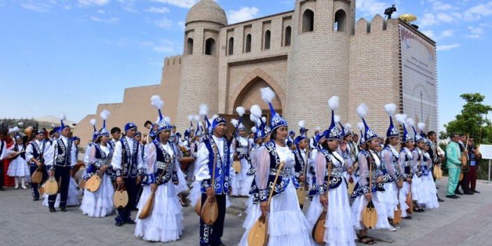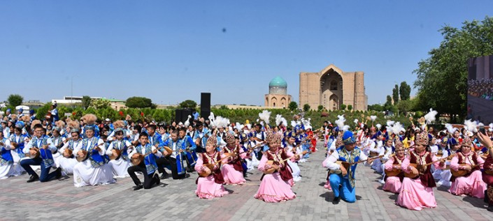 "Ұлттық домбыра" күніне орай Яссауи кесенесінің алдында мың домбырашы Құрманғазының "Сарыарқа", "Балбырауын", Түркештің "Көңілашар" күйлерін орындады. © Түркістан облысы әкімінің баспасөз қызметі