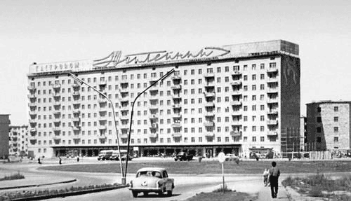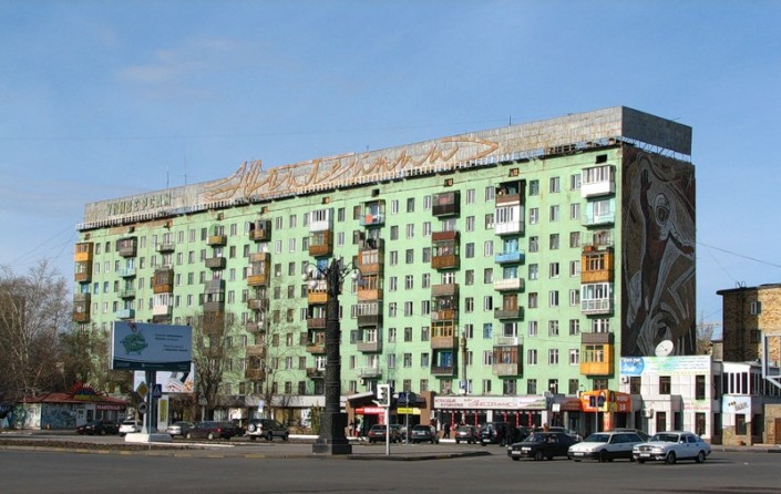 Еще одним доказательством непрерывной связи Караганды с развитием полетов в космос является магазин "Юбилейный". Этот универсам в советские годы был основным зданием шахтерской столицы. Девятиэтажный дом с торца имеет рисунок из мозаики, на котором запечатлен выход человека в космос.