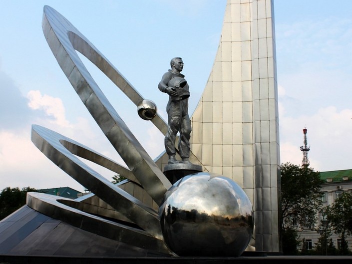 В Караганде очень много достопримечательностей, связанных с космонавтами. Например, скульптурная композиция, посвященная 50-летию космонавтики. Она расположена на площади Юрия Гагарина.