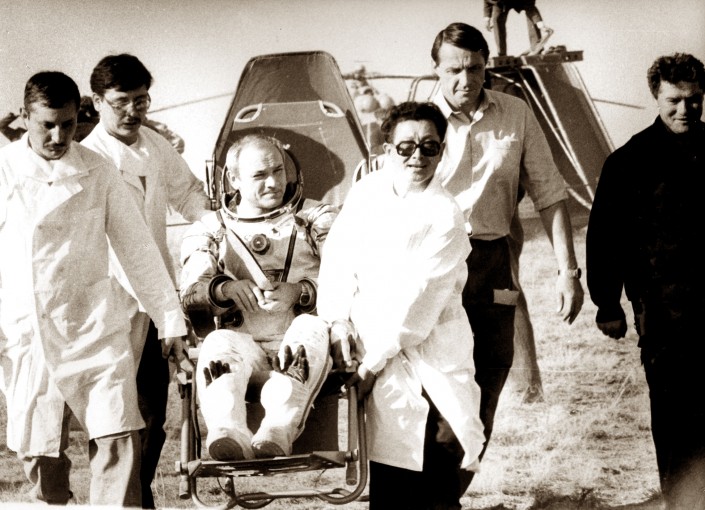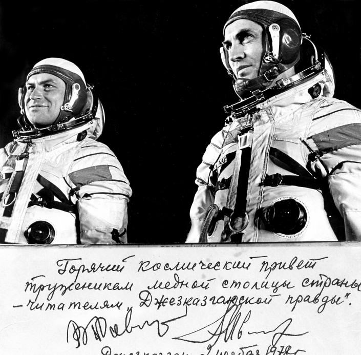 Следом за американским астронавтом Актау в 1981 году посетили и советские летчики-космонавты Алексей Леонов и Владимир Джанибеков. Леонов прославился тем, что первым в мире в марте 1965 года совершил выход в открытый космос, во время которого проявил большое мужество, особенно во время нештатной ситуации, когда разбухший космический скафандр препятствовал возвращению космонавта на корабль. Алексей Леонов находился в открытом космосе 12 минут 9 секунд. При возвращении космического корабля на Землю отказала система ориентации, и космонавты, вручную сориентировав корабль, совершили посадку в запасном районе.