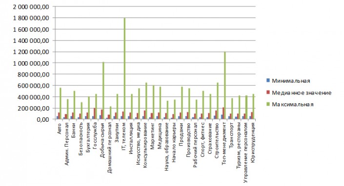 Анализируя данные вакансий, генеральный директор HeadHunter Казахстан Нина Быченко пояснила, что в 2016 году наблюдалось повышение заработной платы в среднем на 30 процентов. Так, самое значительное повышение заработных плат можно выделить в сфере "Государственная служба", где рост составил 63 процента. Примечательно, что и минимальная зарплата в этой области повысилась на 78 процентов. Также значительное повышение заработных плат, более чем на 30 процентов, произошло в сферах "Безопасность", "Авто", "Административный персонал", "Искусство" и "Медиа". Кроме того, в этом году сразу в 4 (!) раза работодатели повысили зарплату в сфере IT. Для сравнения, в 2015 году максимальная заработная плата в этой отрасли колебалась на уровне 450 тысяч тенге, в нынешнем году - 1,8 миллиона тенге.