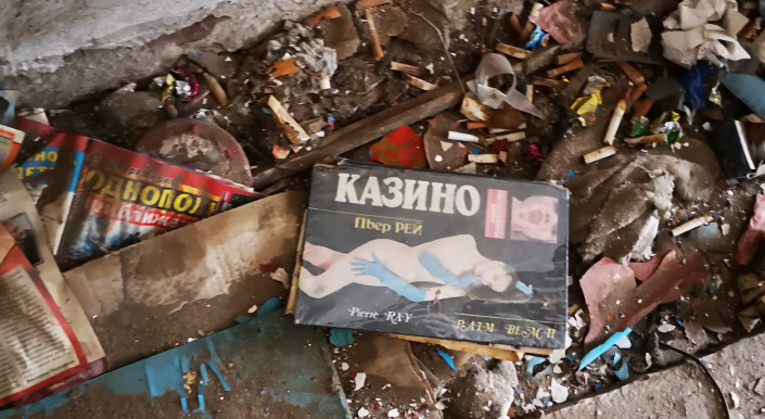 Где-то можно заметить табуретку, где-то чей-то ботинок, где-то более мелкие детали. Нам попалась на глаза пачка из-под папирос с надписью "Душанбинская табачная фабрика". Возможно, здесь располагался какой-то производственный цех, где работали осужденные.