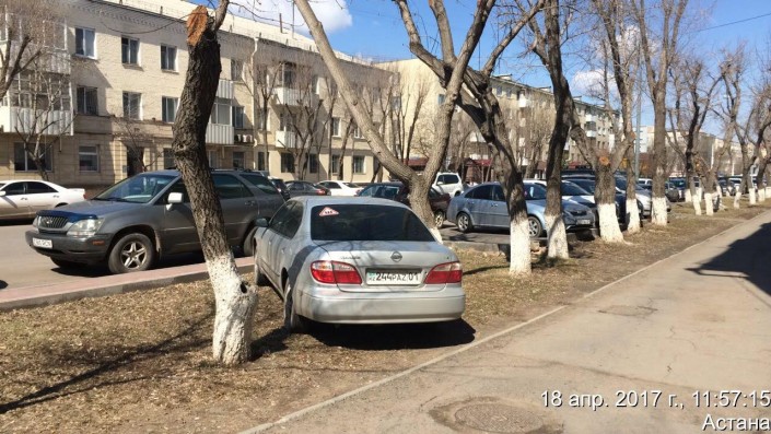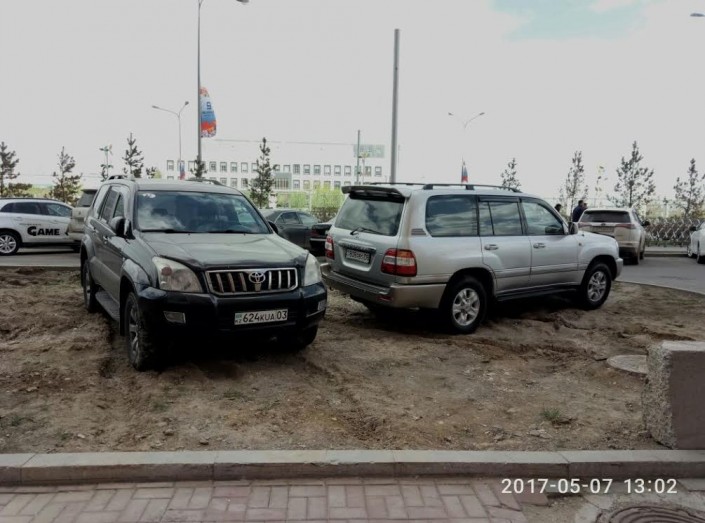Еще одна парковка на газоне, ну или месте, где должен быть газон, в Астане по улице Кошкарбаева, угол проспекта Тауелсиздик.