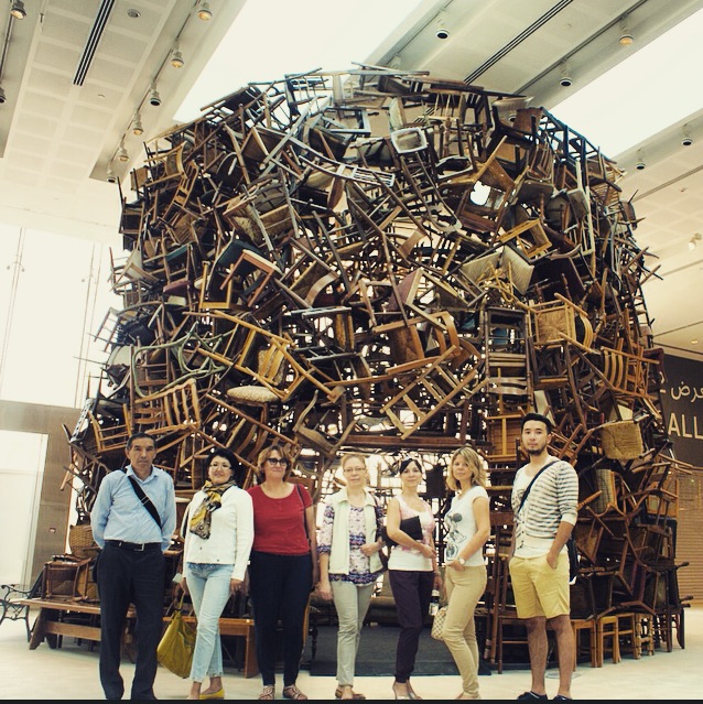 Красочная башня из стульев в культурном выставочном центре Manarat Al Saadiyat на острове Саадият