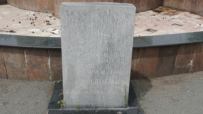 А еще возле этой гостиницы есть примечательный камень, на котором написано, что эта гостиница заложена в знак дружбы братских народов Казахстана и Турции. И подпись: "Н. Назарбаев. 17 августа 1995 года".