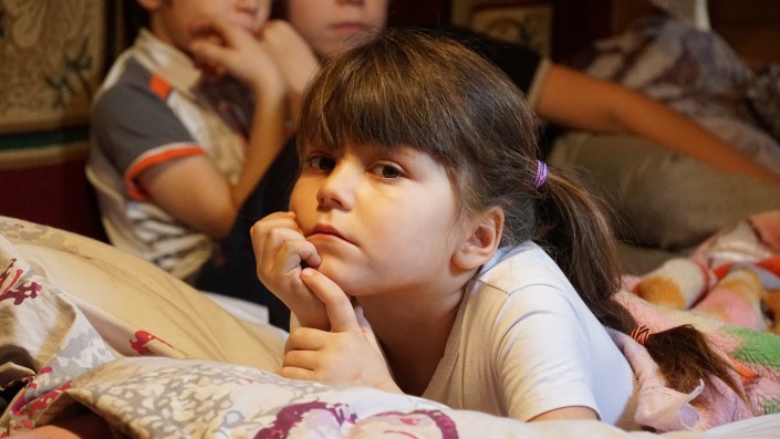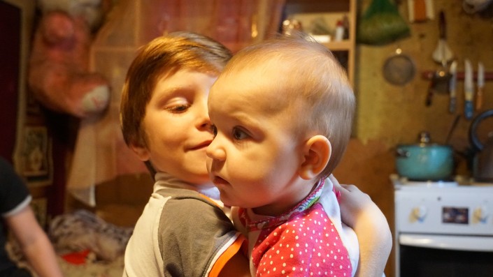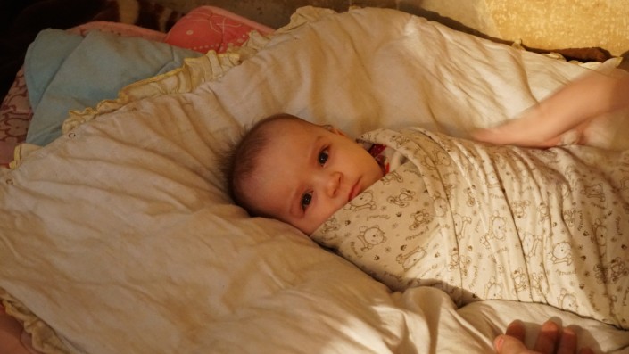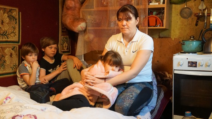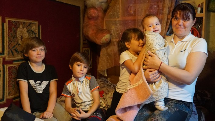 В соседней спаленке в этот момент просыпается самый младший ребенок в семье. Мать берет девочку на руки. Другие дети переключают внимание с телевизора на сестренку.