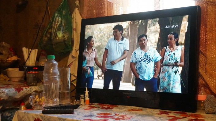 Вся семья жмется друг к дружке, сидя на кровати. Из телевизора доносится песня: "Мариям Жагор деген орыс қызы...".