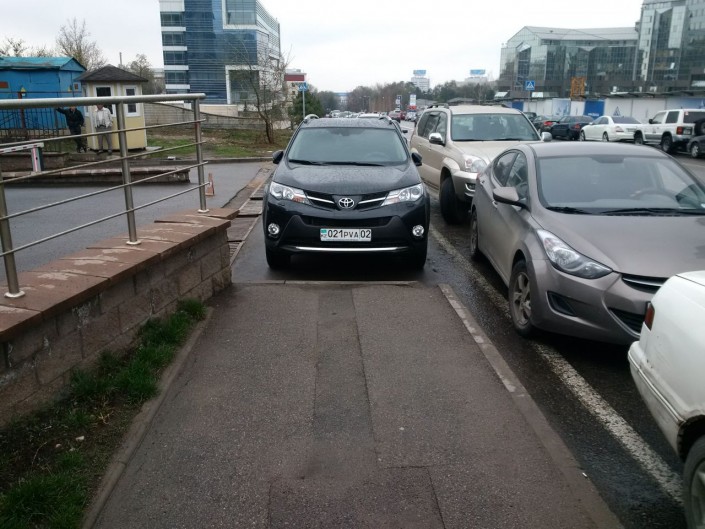"Мастеров" парковок в Алматы много. На фото автомобили Mitsubishi и Toyota оставили прямо на пешеходном тротуаре.