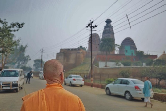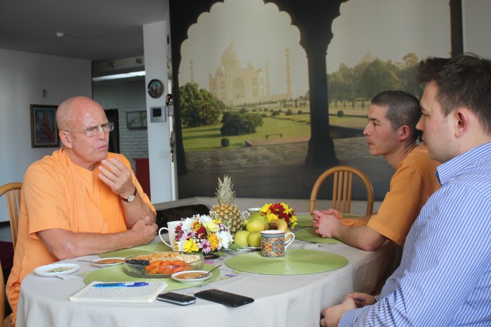 Как-то несколько лет назад один из моих друзей монахов приехал в Алматы. Я предложил ему поехать в Чарынский каньон, он согласился. Мы сели в машину, заполнили ее едой для пикника и поехали в Чарынский каньон. И когда мы прибыли на место и спустились в самый низ, туда, где течет река, то увидели одного западного парня. Он сидел, у него были длинные волосы и борода, рядом был велосипед с большими сумками по бокам. Я понял сразу, что он путешествует на велосипеде. Когда подошло время обеда, я предложил ему присоединиться, он был не против. Выяснилось, что он британец, начал свое путешествие из Ноттингема до Турции, был в Иране, Узбекистане, Кыргызстане и как раз сейчас пересекал Казахстан. Он сказал, что поедет в Китай, потом в Тибет, оттуда в Непал, потом планирует прибыть в Индию, в Агру. Я ему сказал, что в 80 километрах от Агры мой дом - Вриндаван, когда приедешь туда, то и остановишься у меня.