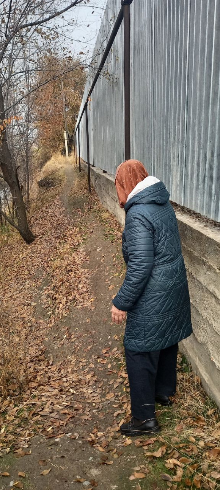 Райхан 66 лет, она живет по адресу Азербаева - 2. Там, на побережье реки, находятся 7 домов. Дороги к домам нет.