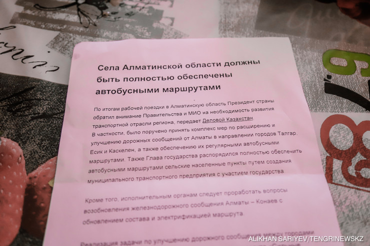 Потом говорили, что акимат Талгарского района должен выделить бюджет на субсидирование. Но туда как ни приедешь, говорят, денег нет. Государство ведь дает им деньги. Ну где эти деньги? Мы понять не можем.