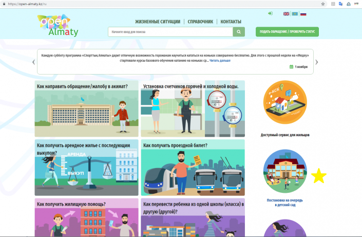 Уже уходя, я спросил: "Имея ключ ЭЦП, смогу ли я через сайт Egov.kz поставить сына в очередь в детский сад?" И тут открылось, что нет. Оказывается, все дальнейшие действия для алматинцев необходимо проделать, зайдя на сайт https://open-almaty.kz или посетив в общественную приемную акимата (OpenAlmaty) по адресу: Сатпаева - Байзакова. В Астане все описанные ниже действия можно проделать, зайдя на портал столичного акимата https://e.astana.kz