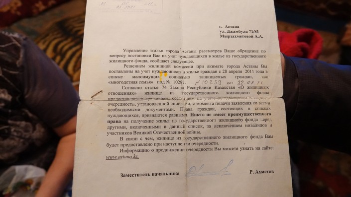 В 2011 году Мырзахметовы встали в очередь на социальное жилье. Тогда у них было пять детей и 10 287-е место в очереди. Спустя девять лет у них шесть детей и 5 544-е место. То есть получения жилья придется ждать еще девять лет.