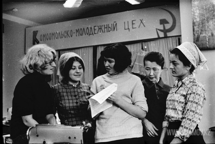 1975 год. Работницы швейной фабрики имени Маншук Маметовой что-то обсуждают.