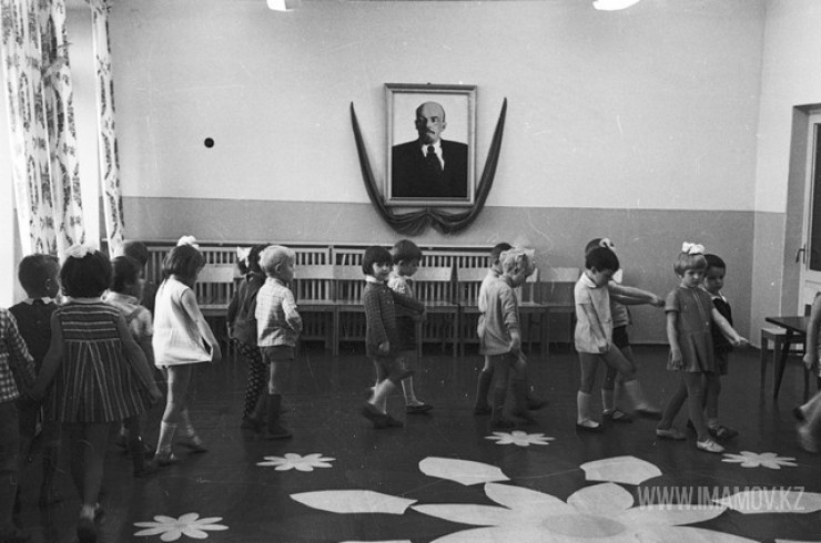 Репортаж из детского сада № 45 "Тюльпан", 1970 год. Дети водят хоровод, на фоне висит портрет Ленина. Героям снимка сейчас больше 50 лет.