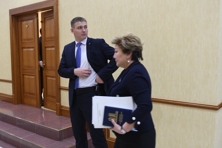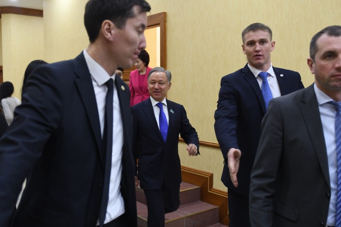 Тем временем заседание Мажилиса еще даже не думало заканчиваться. Но в какой-то момент охранники Нигматулина приняли выжидательную позицию. Очевидно, им поступил сигнал, что сейчас должен выйти их шеф. Нурлан Нигматулин действительно покинул заседание, оставив ведение пленарки вице-спикеру.