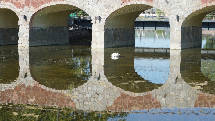 Посередине пруда лебедь-одиночка свернулся калачиком и спал. Он был на своей нейтральной территории - между парой белых и черных лебедей. В парке наступил тихий час. Говорят, продлится он до после обеда, а к вечеру лебеди снова начнут активничать.
