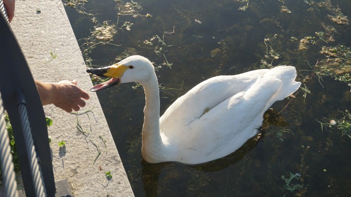 "Клевером", - ответил он. Этот человек приходит сюда почти каждый день и уже давно подкармливает лебедя.