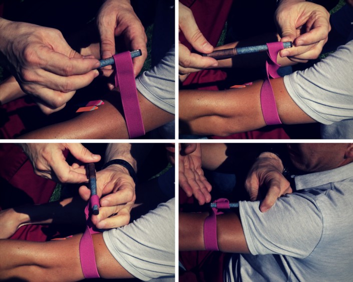 3. Затягиваем жгут сильно. Для более четкой фиксации на конечностях, можно использовать карандаш, палку, ручку.