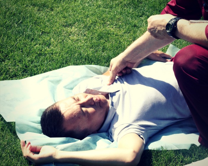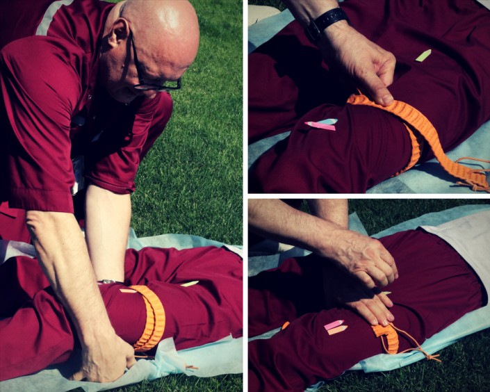 Кровопотери из брюшной полости также опасны для жизни, поскольку в этой области проходит самый крупный сосуд, из которого исходят все "ветки" артерий. В первую очередь нам необходимо согнуть ноги пострадавшего и прижать кулаком аорту к позвоночнику. По ощущениям, конечно, неприятно, но, чтобы не погибнуть, раненому придется потерпеть.