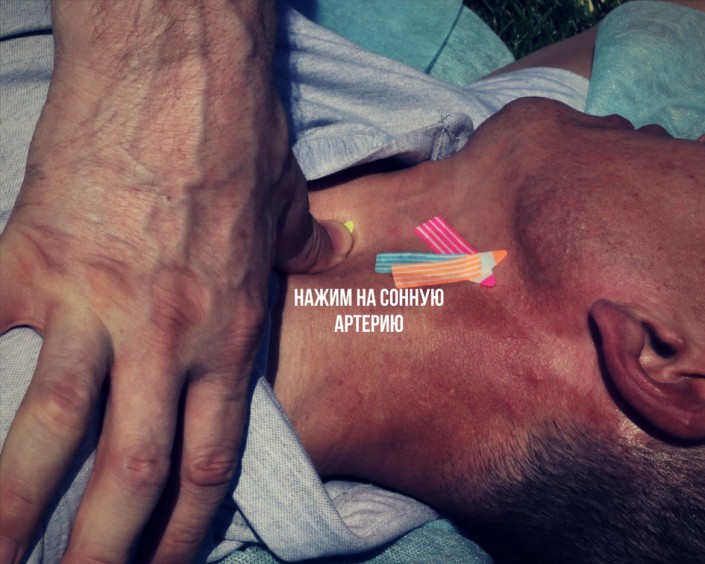 Если рана находится на шее, то необходимо нащупать сонную артерию (она будет пульсировать) и надавить на нее. Здесь не имеет значения, какое кровотечение - артериальное или венозное, ведь если мы пережмем артерию, то по ней не будет циркулировать кровь, и, соответственно, поступать в венозную сеть она тоже не будет.