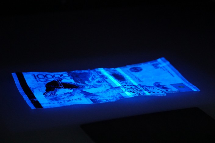Еще одна степень защиты -  люминесцентная краска, которая видна лишь в ультрафиолетовом спектре. Для проверки купюры загружаются в специальный прибор.