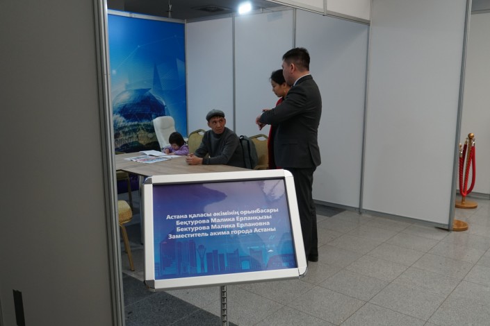 В прошлую пятницу аким Бахыт Султанов принимал людей прямо в этом коридоре. От желающих попасть к нему на прием его отделяли лишь вот эти турникеты. На этот раз он принимал граждан в отдельном кабинете. По всей видимости, акиматовские работники сделали определенные выводы после встречи с многодетными матерями. Ведь тогда женщины несколько раз пытались снести выставленные турникеты.
